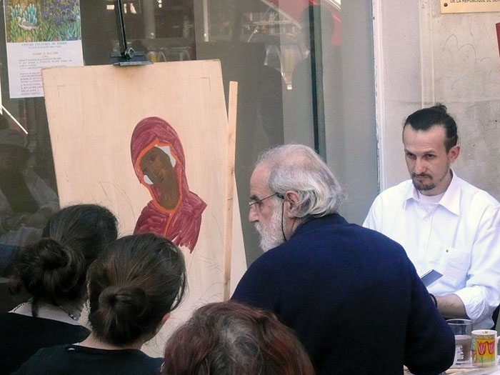 When we are on the bus and we arrive at the bus station, we see genuine faces and glances. Nevertheless, cinema and fashion have instructed people to be pretentious and to adopt a fake manner of standing, speaking, and moving. This constitutes an alienation of the human person. As an artist, I strive to discover the real humanity. We have even lost the scent of carnation. The sellers of carnation say that the scent is gone, even though the form remains the same. It is carnation in the form, but it is not full since it has no particular scent. As an iconographer, I have to depict a saint. The saint is a man who stands before God and before his fellow man with love. He is in a state of confession. Me too; I am in a state of confession at this moment. I am trying to express what is my problem. As the ancient philosopher Diogenes said, “I am searching for a man.” Indeed, we are searching nowadays for a man who does not seek one’s self-interest, who is not cunning and devious. We are accustomed to playing roles; honesty is thus tricky. One way would be to depose the masks we are searching for and find the true “me.” And if I find the true me, I can see the true “you”.