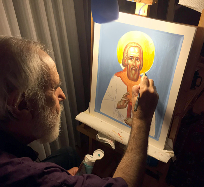 Along with his wife Marina he spent two years in Serbia, mostly in the Monastery of Cheliye, in the immediate vicinity of Fr. Justin (Popovic) – today St. Justin of Cheliye. During that period he decorated the monastery chapel devoted to St. Stefan the Decansky. He was initiated into the priesthood and since 1979. he has been serving in Athens.