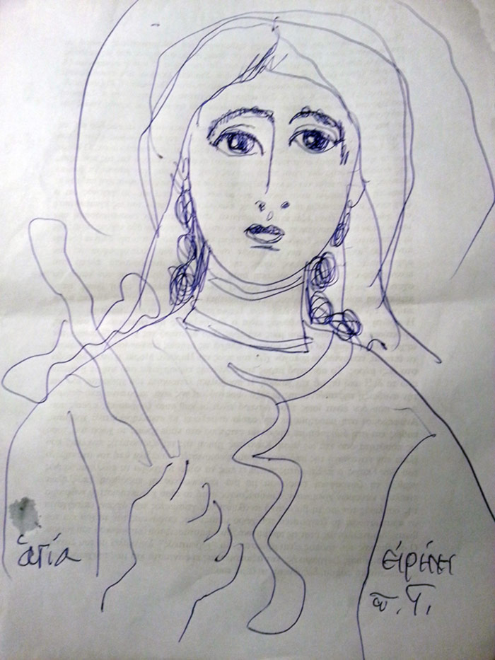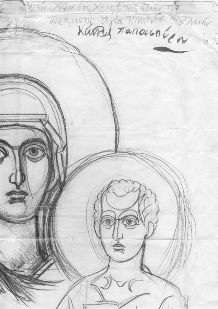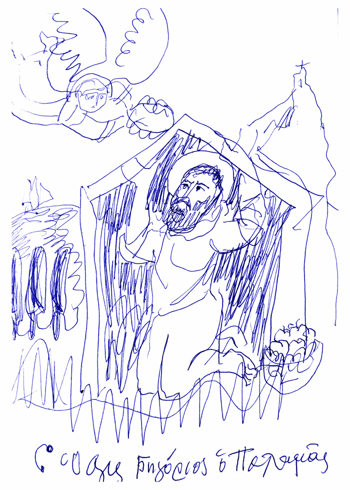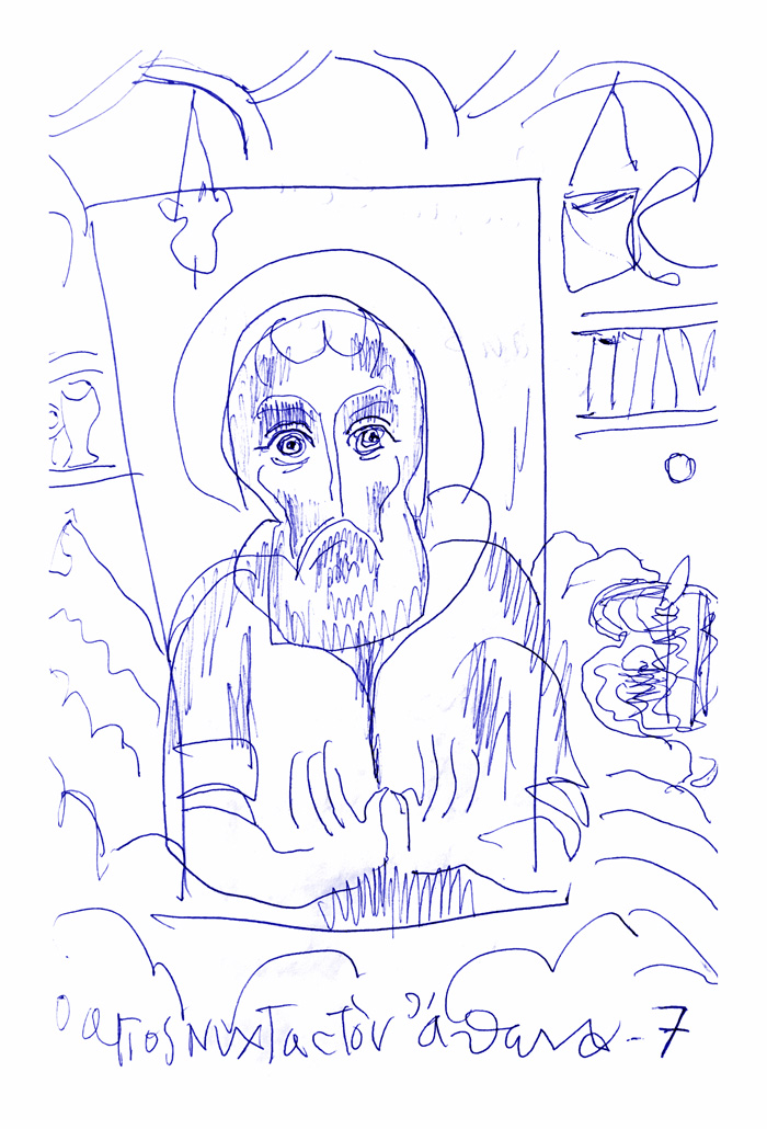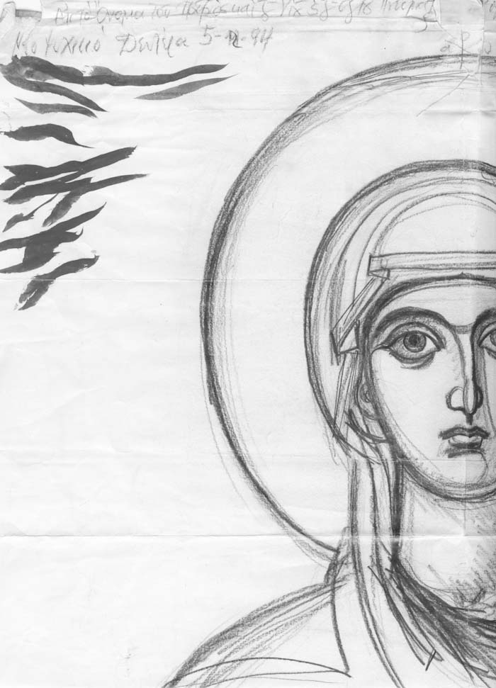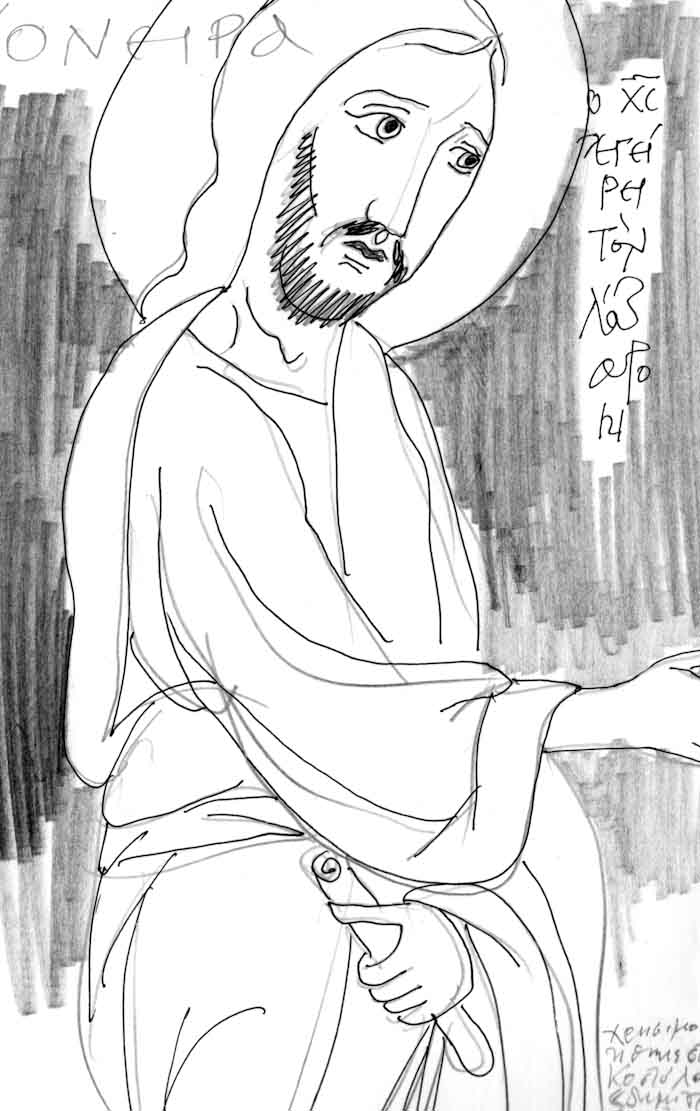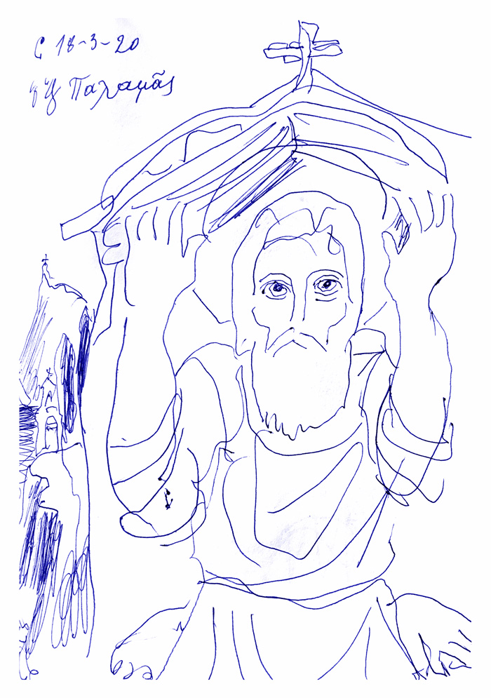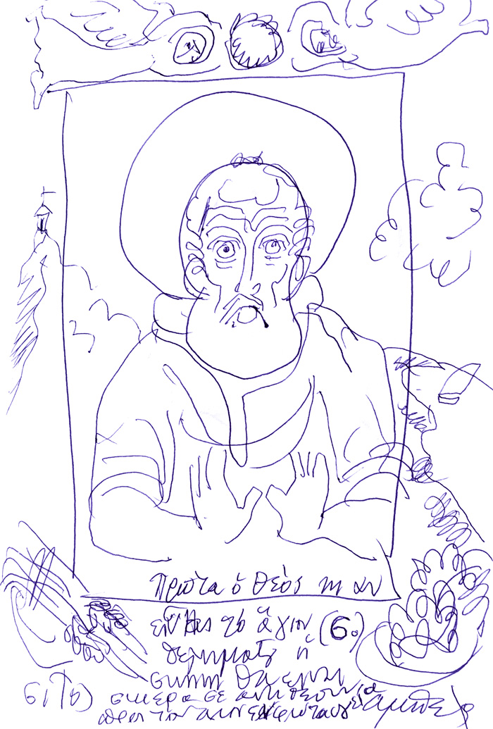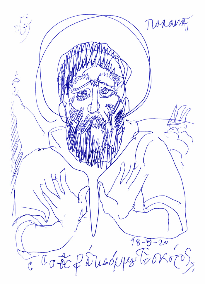 With this drawing Fr Stamatis inaugurates a new series of icons. The depict usually a Saint who is projected to through our window and greets us in the Paradise. In some icons the Saints speak with us. They are ready to listen to our prayers and accept them.