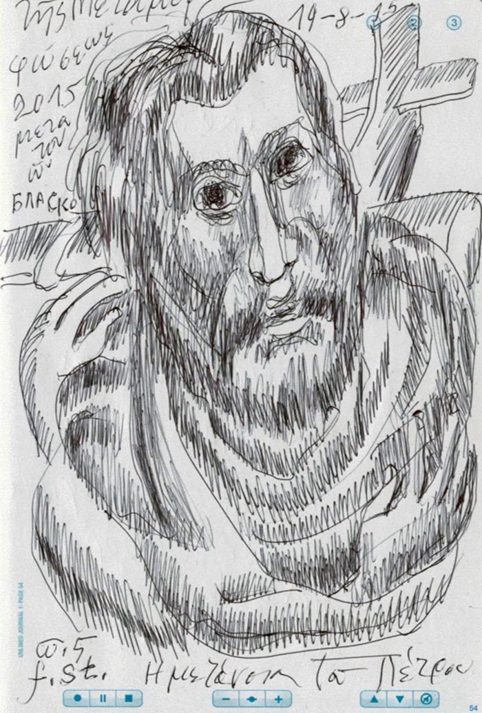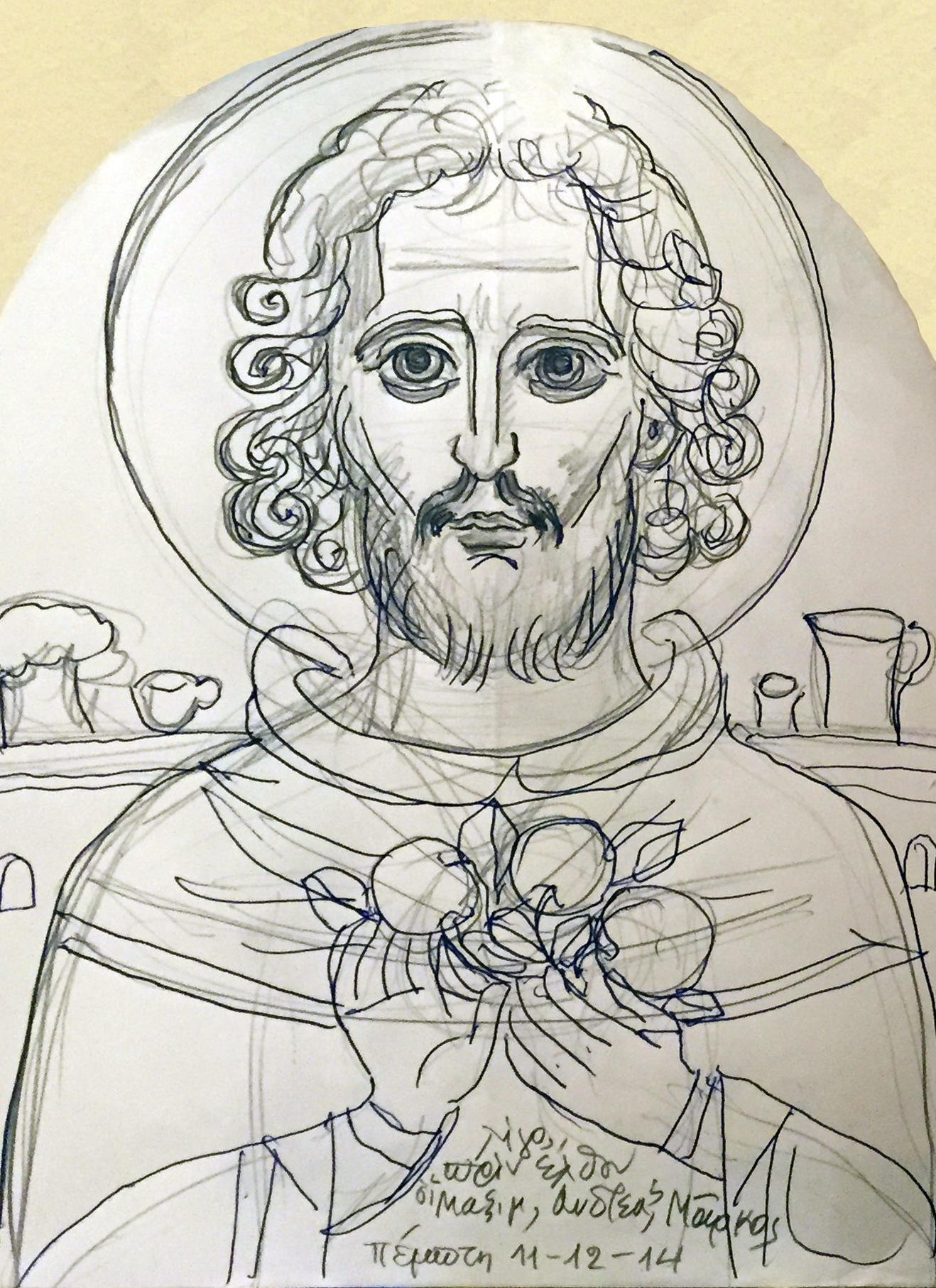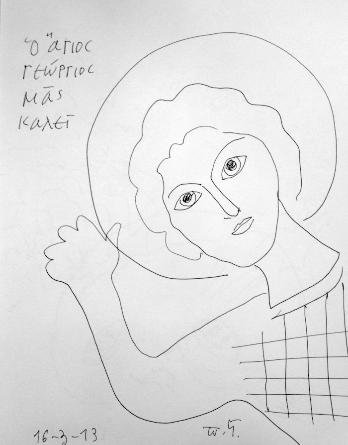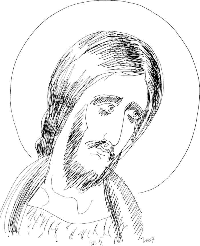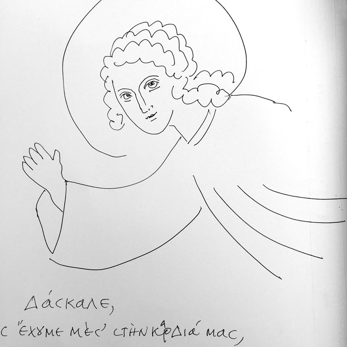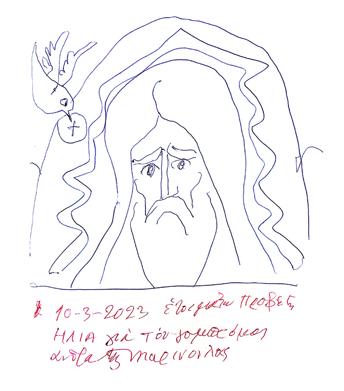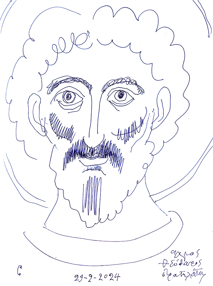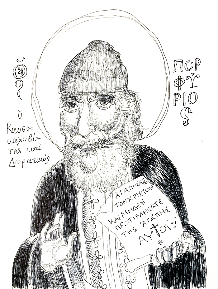 With this drawing Fr Stamatis inaugurates a new series of icons. The depict usually a Saint who is projected to through our window and greets us in the Paradise. In some icons the Saints speak with us. They are ready to listen to our prayers and accept them.
