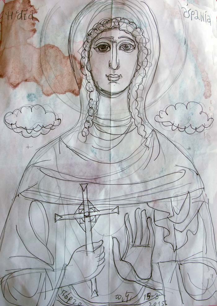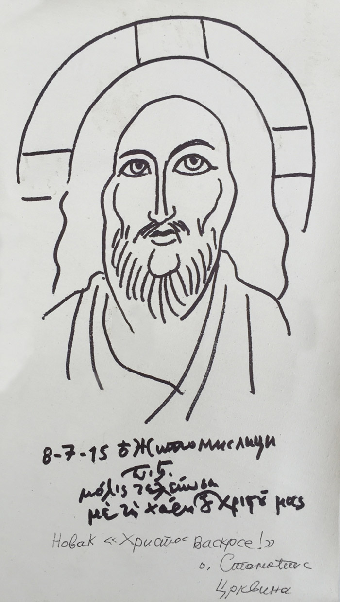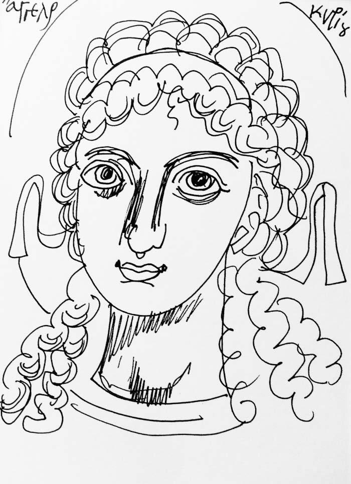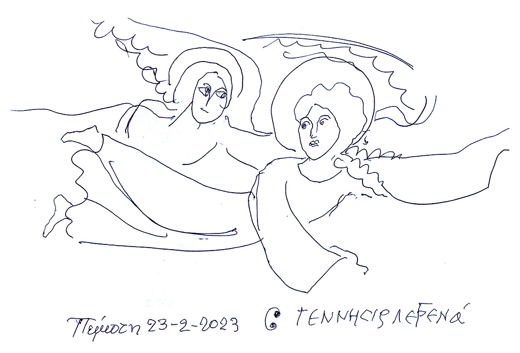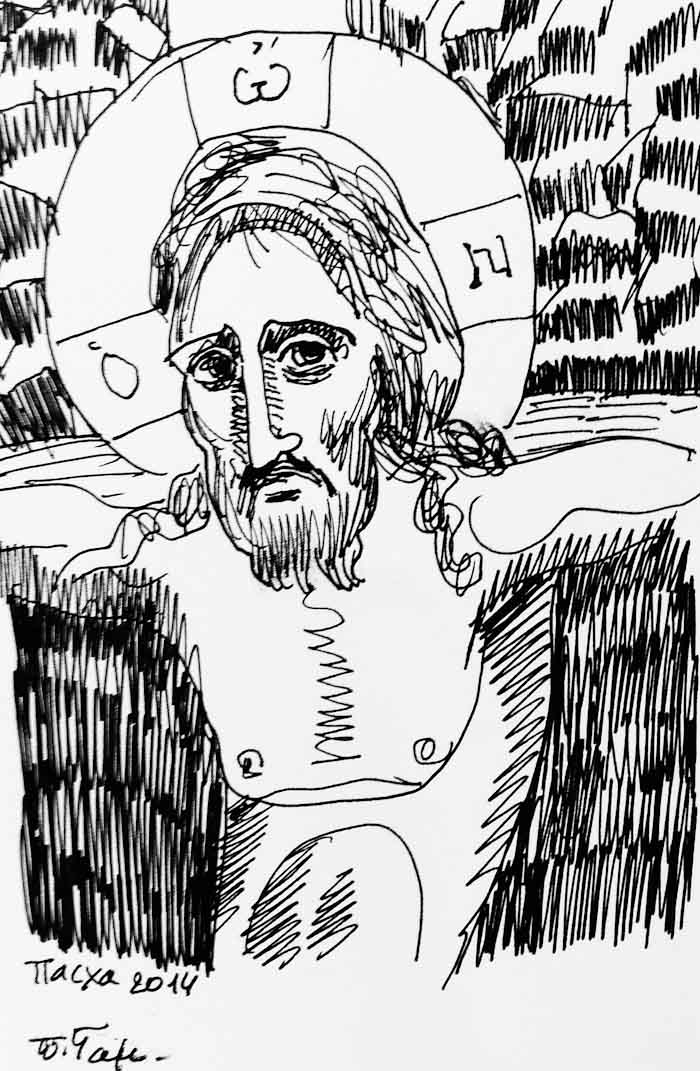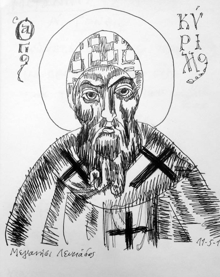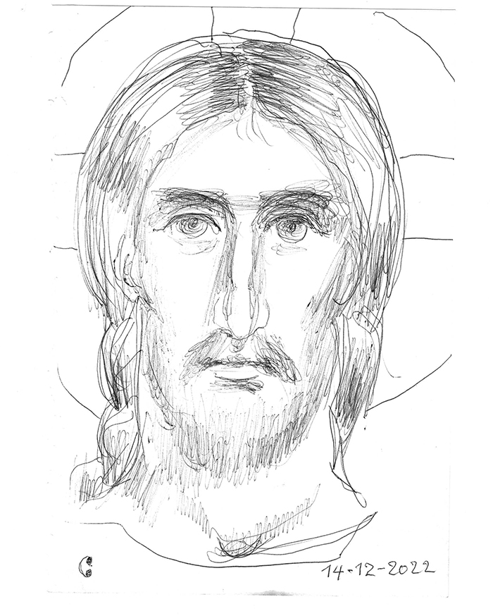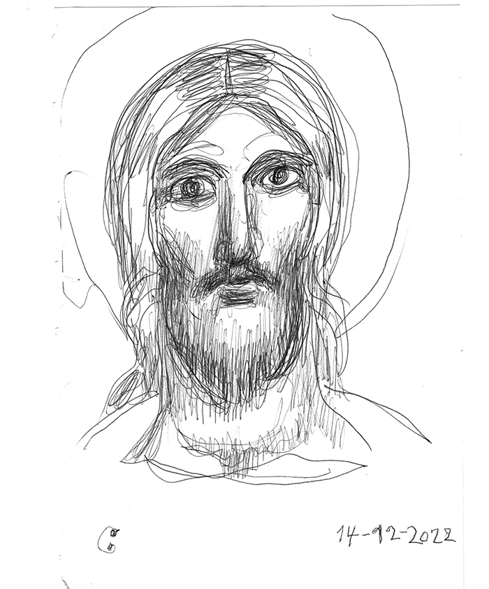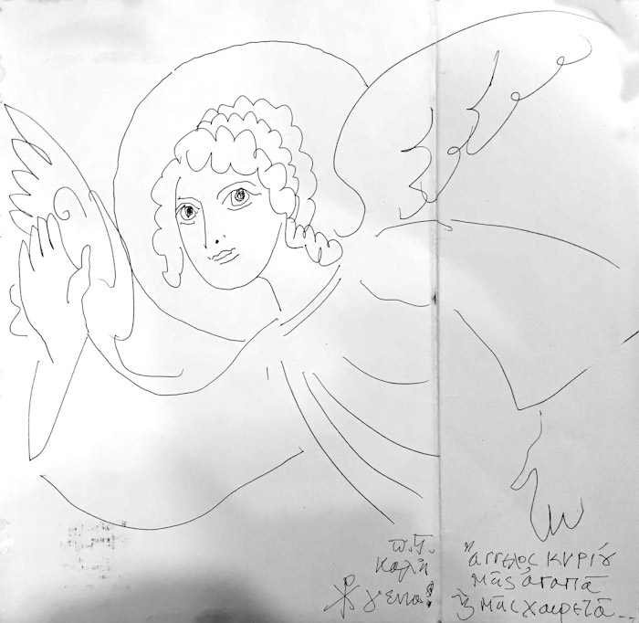 With this drawing Fr Stamatis inaugurates a new series of icons. The depict usually a Saint who is projected to through our window and greets us in the Paradise. In some icons the Saints speak with us. They are ready to listen to our prayers and accept them.