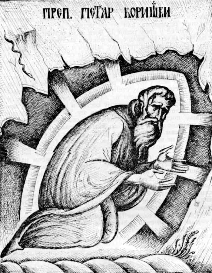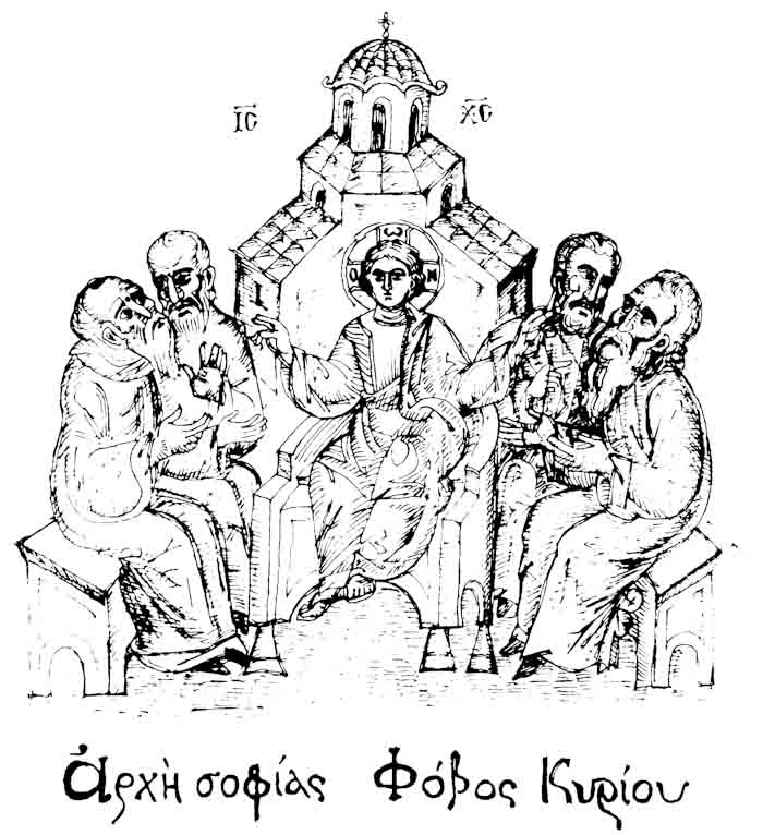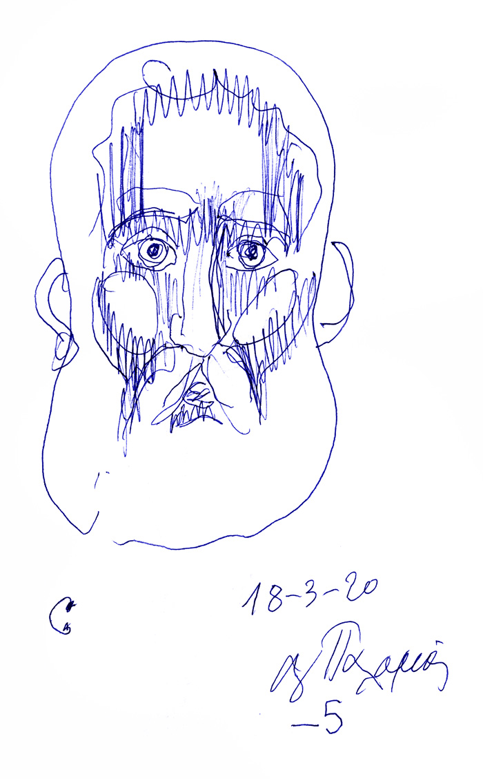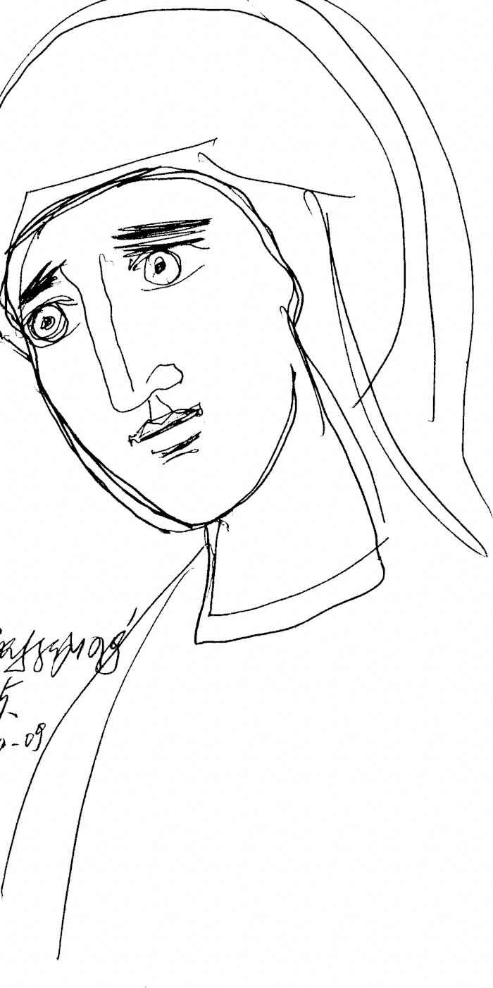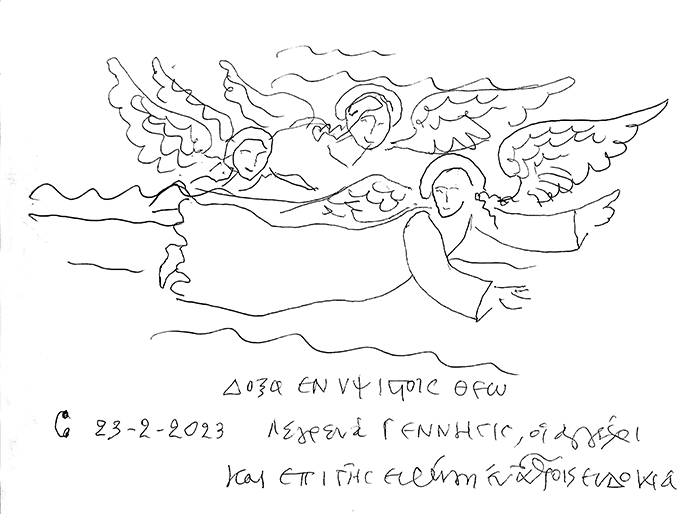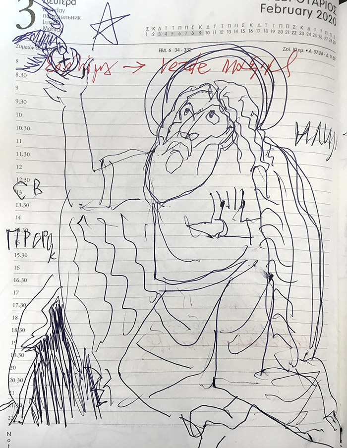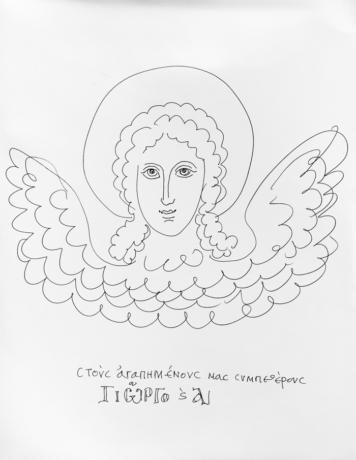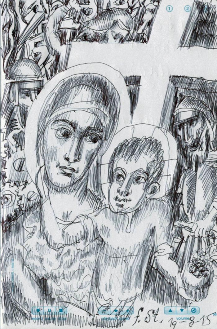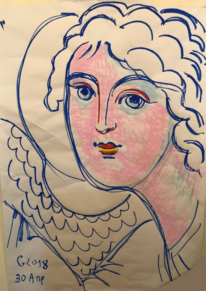 With this drawing Fr Stamatis inaugurates a new series of icons. The depict usually a Saint who is projected to through our window and greets us in the Paradise. In some icons the Saints speak with us. They are ready to listen to our prayers and accept them.