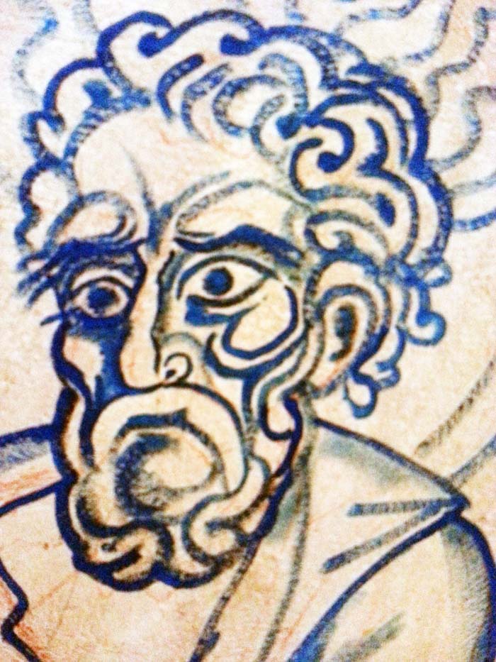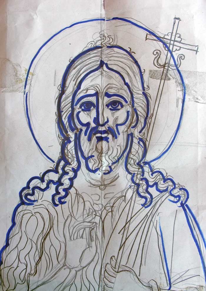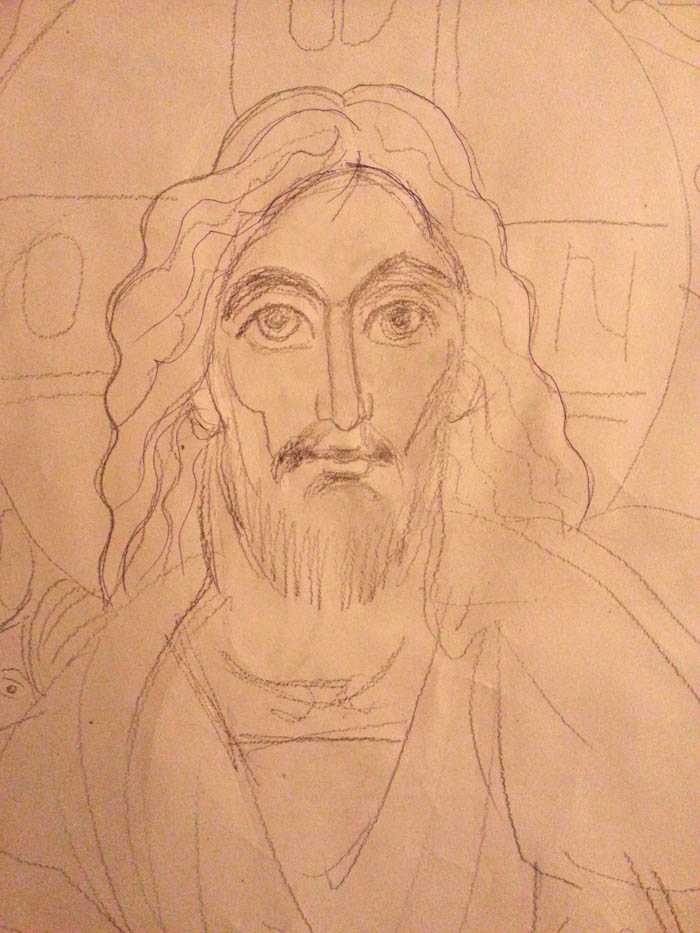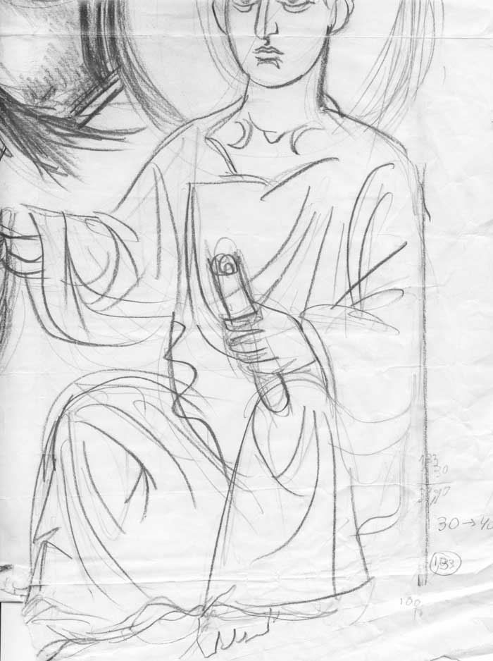 Fr Stamatis has finished the Pantocrator. Now in May 2014 he is designing the four Evangelists on paper so that the drawings can be copied on the walls of St Nektarios in Ano Voula, Attiki. Here is a detail of the drawing of St Mark during the rendering. (May 20, 2014)