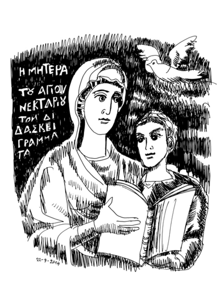 St Nektarios' Mother Teaches Him Letters, drawing, 2014.