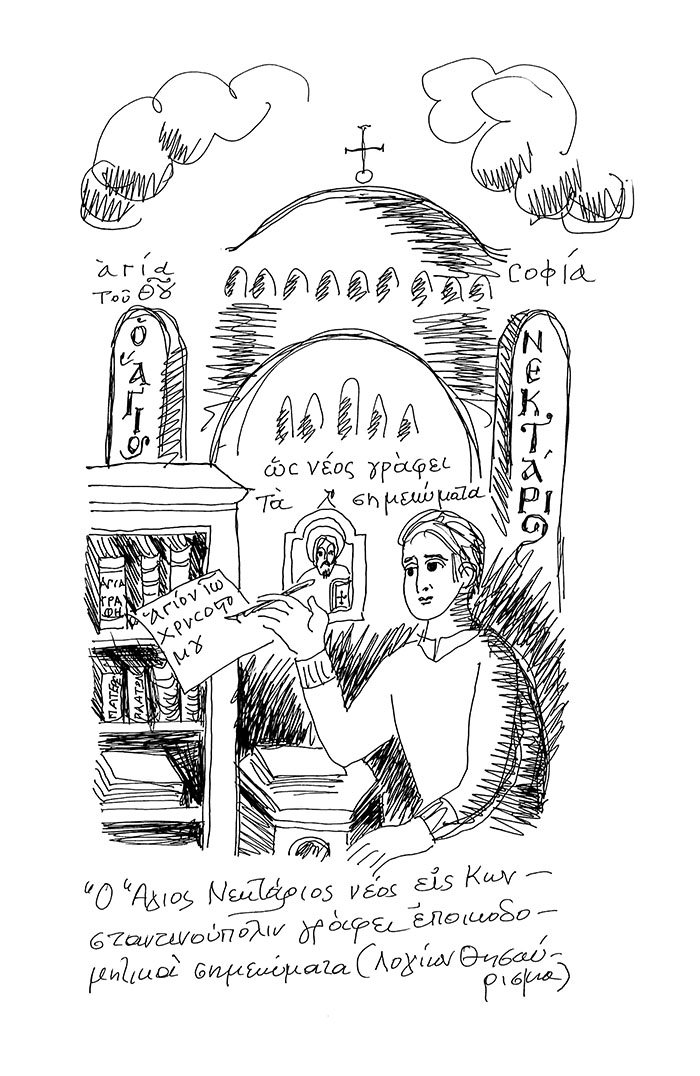 "The young Nektarios in Constantinople writes his notes" (Logion thisavrisma), drawing by Stamatis Skliris, 2014.