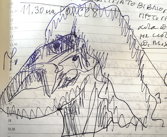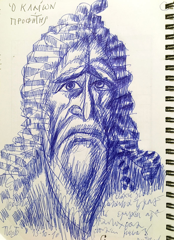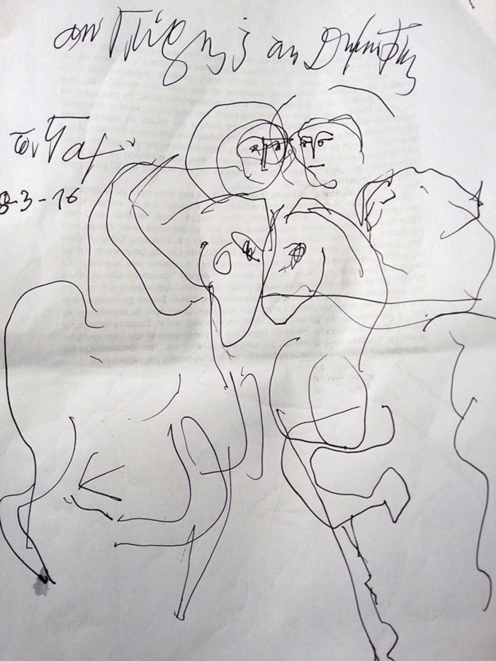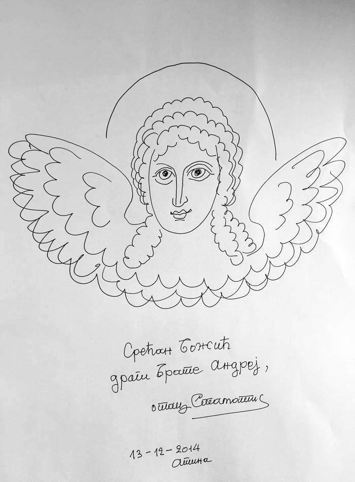 On Saturday 10the of May, 2014, in the theater “TRIANON” in Athens a movie with titled “THE ICONOGRAPHY IN LIGHT OF HOLINESS" was projected; with Stella Arkenti, as producer and Sotiria Adam as music director, showing the ARTISTIC WORK of Fr Stamatis Skliris. The speakers were: Fr. Petros Minopetros, film director, Haris Kambouridis, art critic, and Demetrios Kyriazis, psychiatrist. At the end of the event, Fr Stamaris Skliris signed the DVD of the movie on the spot, and drawn on each of them a sketch, a total of 60 drawings. Some of them are displayed here.