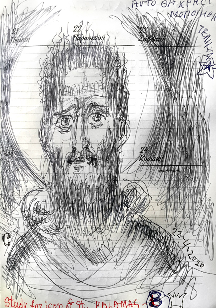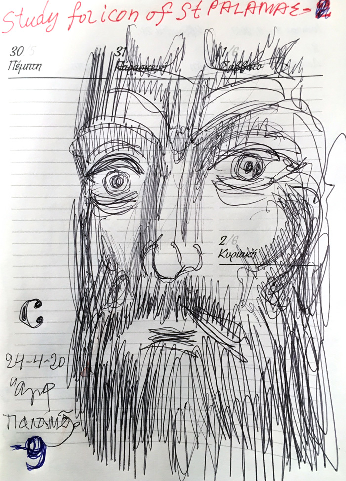 "St Gregory Palamas Praying 'Lord, Enlighten my darkness'," drawings for an icon, 2020