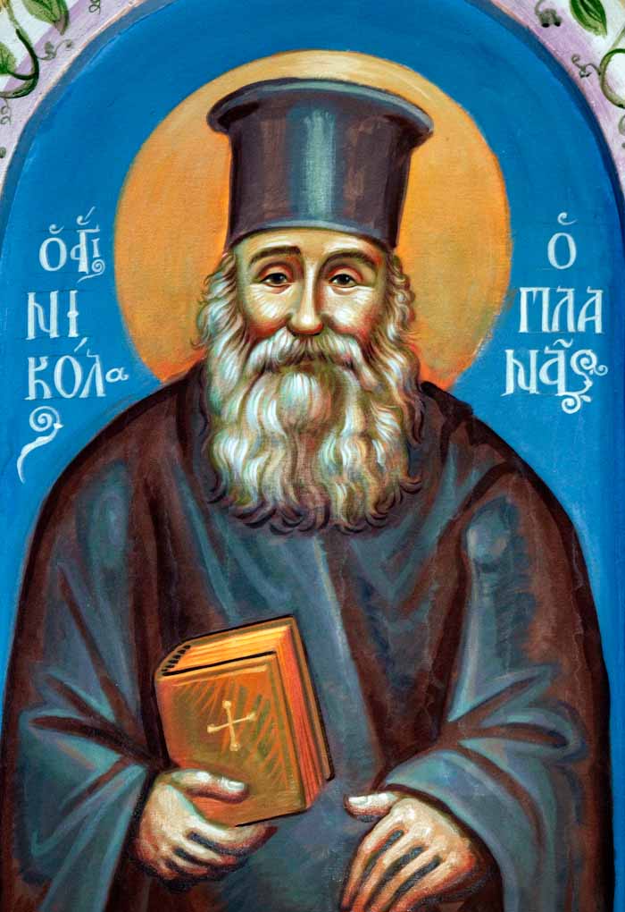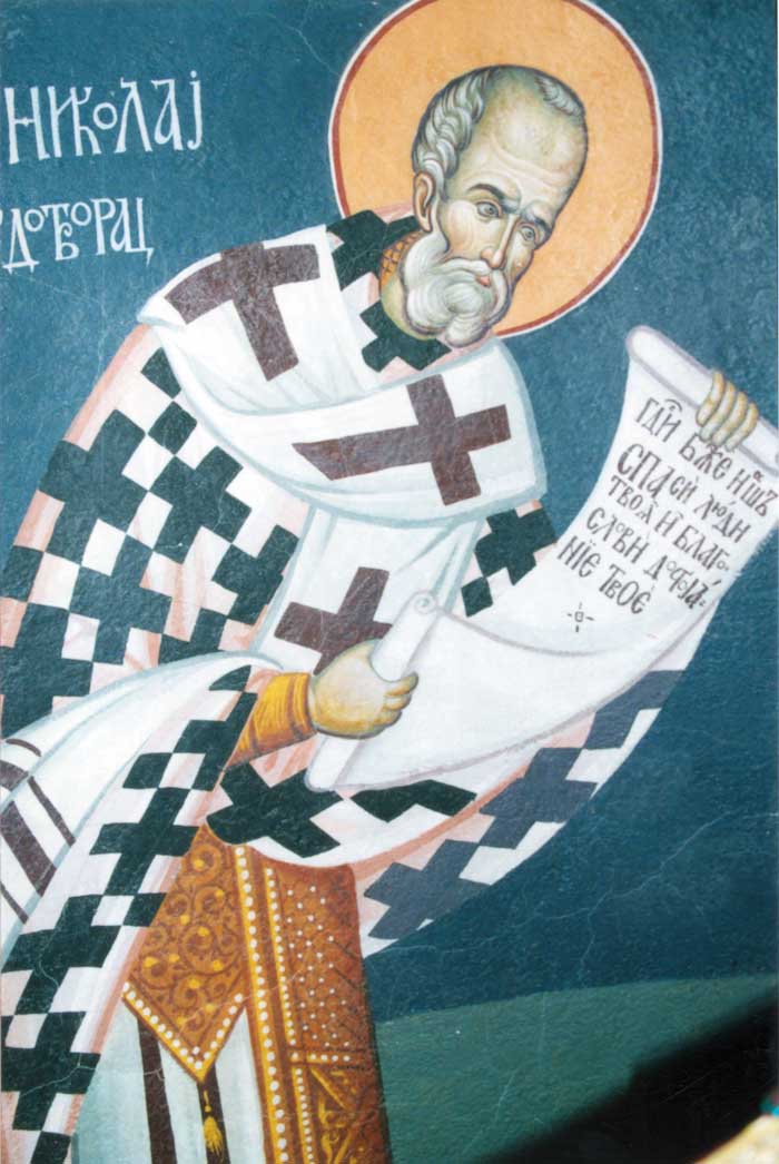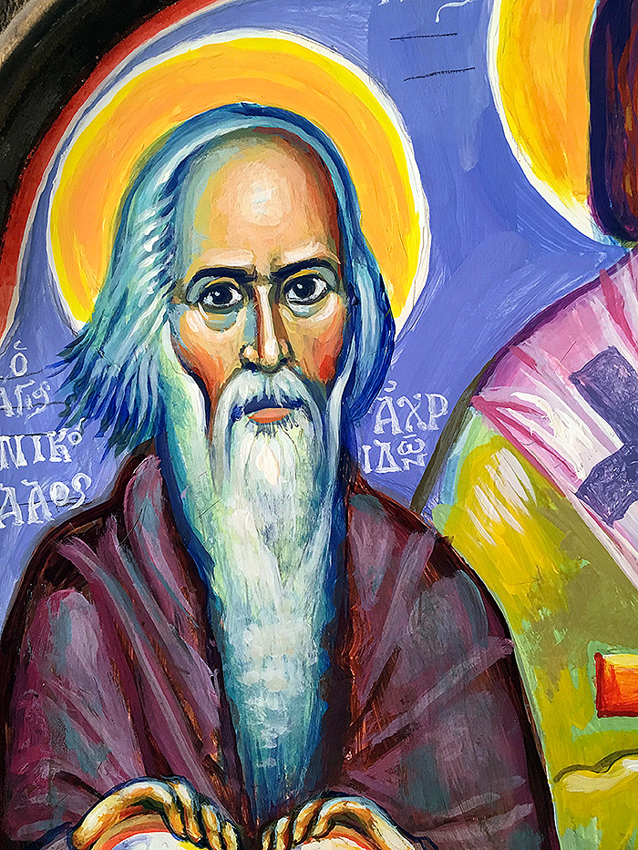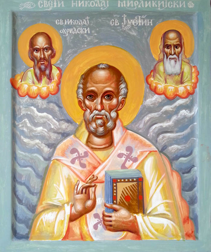 St Nicholas of Myra with St Nicholai of Žiča and St Justin of Ćelije, detail, egg tempera on wooden board, 2015/01/16 (owned by Aleksandar Radičević)