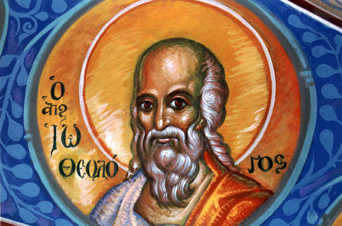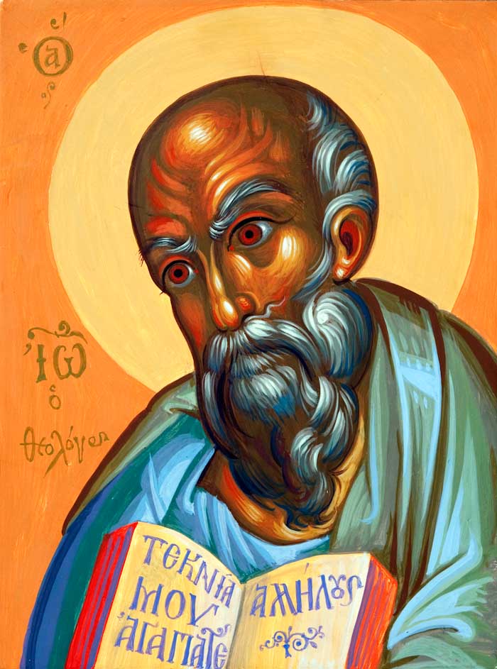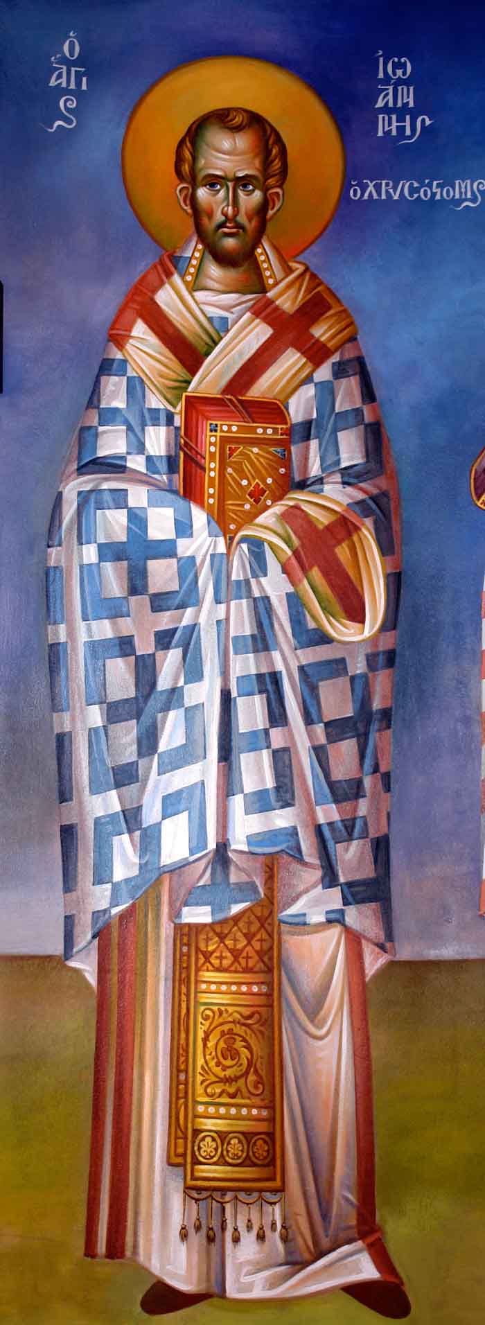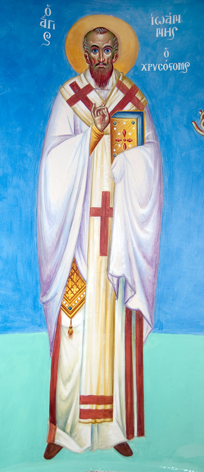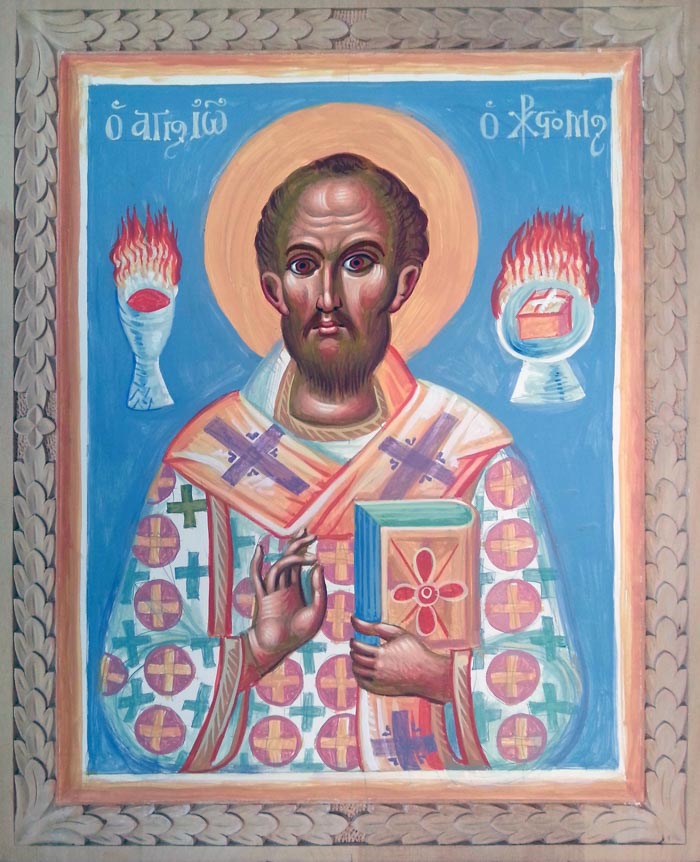 St John Chrysostom, egg tempera on wooden board, 2015. Painted with God's help on Tuesday, January 20, 2015. Special characteristics: The Saint is not watching us but the Holy Altar. His eyes are red reflecting fire. He is not smiling but ecstatically facing the awesome sacrifice. He is seeing something that we can not see. To the right of him is the Holy Chalice, and to the left is the Paten (Diskos) bearing the LAMB. Divine Communion is the Fire that burns.