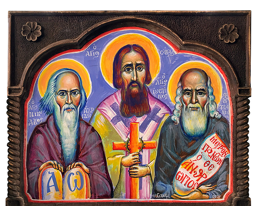 "Three Serbian Saints: Sava, Nicholai, and Justin", acrylic on board, 2020, Stamatis Skliris