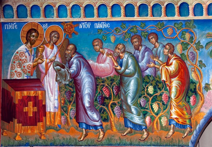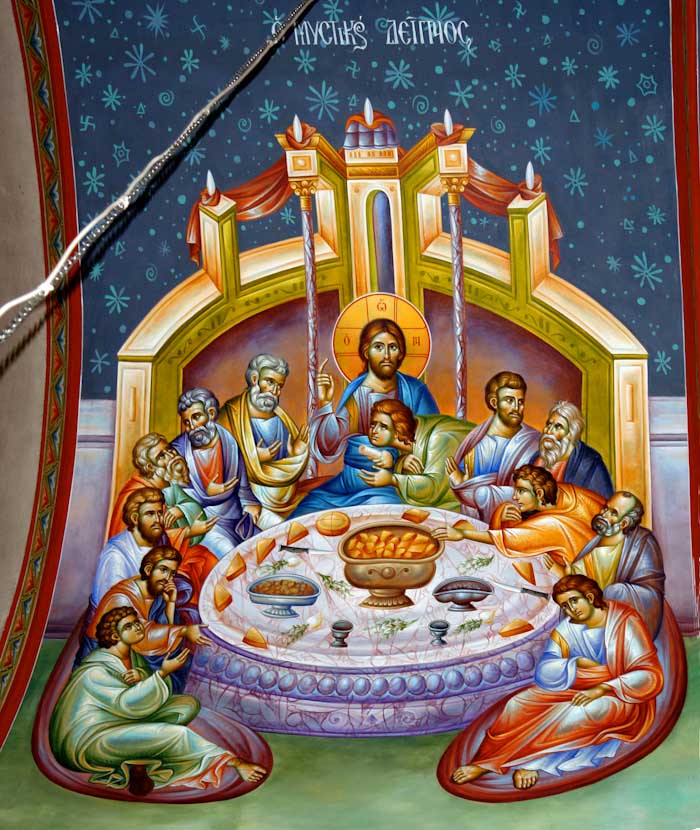 Aυτή η εικόνα είναι τελειωμένη, διότι στο στάδιο αυτό της αναπτύξεως της κατασκευής της ειπώθηκαν όλα όσα έπρεπαν, τόσο, ώστε αν συνέχιζε να τα επεξεργάζεται ο δημιουργός της περαιτέρω, θα άρχιζε να αποικοδομείται η πληρότητα ως έκφραση του μυστηρίου ΜΥΣΤΙΚΟΥ ΔΕΙΠΝΟΥ ΚΑΙ ΘΕΙΑΣ ΚΟΙΝΩΝΙΑΣ ΤΩΝ ΑΠΟΣΤΟΛΩΝ. Αν έκανα τα «άγρια σαν ατελείωτα» σημεία της ΕΙΚΟΝΑΣ πιο λεία και τελείωναν θα χανόταν η ανησυχία των μαθητών στο άκουσμα των λόγων του δασκάλου πως πορεύεται προς θανάτον. Γιαυτο τάφησα σαν ατελείωτα. Αν πάλι άφηνα το Πρόσωπο Χριστου σαν ατελείωτο θα χανόταν η ηρεμία του Διδασκάλου λόγω θείας φυσεώς Του, η οποία εγγυάται την εσχατολογικά Ειρήνη παρά την τραγικότητα του Σταύρου. Μάλιστα η θεία Ειρήνη-ΧΡΙΣΤΟΣ γέρνει προς τα δεξιά της (αριστερά όπως βλέπουμε εμείς), για να φανεί πως δεν είναι μόνο έξω του κόσμου, αλλά σκύβει πάνω και στα καθημερινά μας προβλήματα.