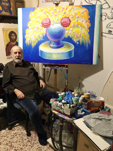 "It's Flourished" (a vase with flowers), acrylic on canvas, Stamatis Sklirs 2019