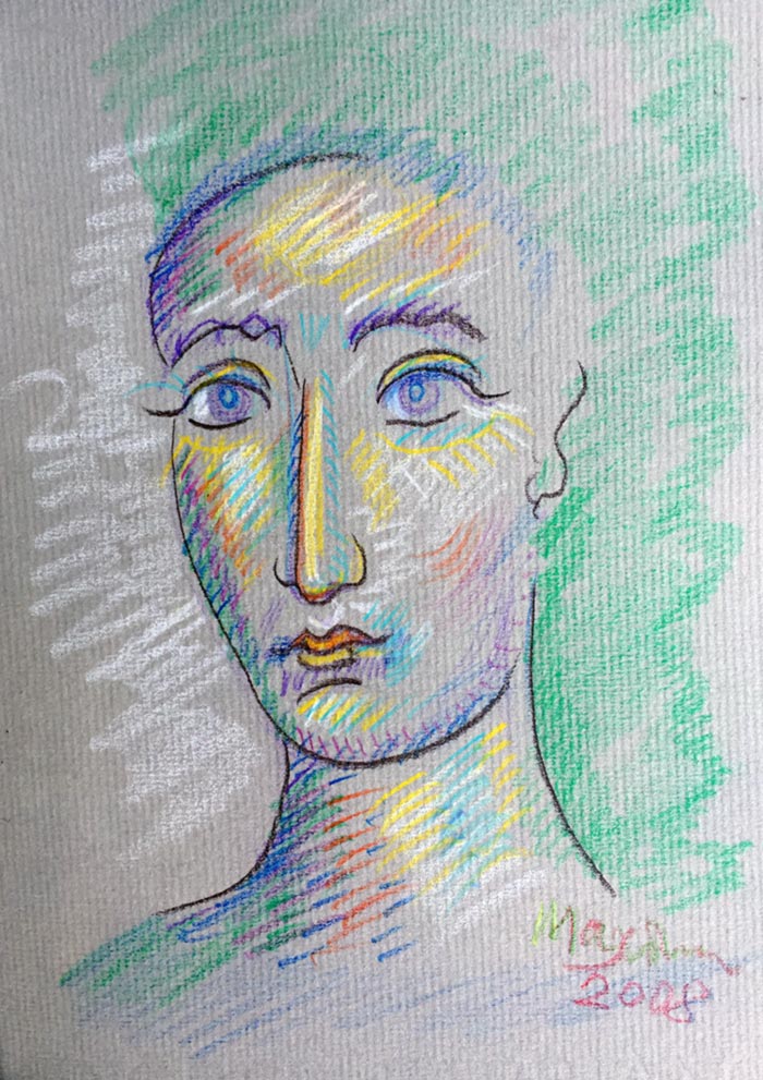Created in the quiet, disorienting months of the COVID period, this lyrical painting captures a moment of inward searching and hopeful imagination. A tranquil blue face turns toward a radiant golden ship gliding over deep cobalt waters—an emblem of journeys dreamed rather than taken, and of horizons longed for while the world stood still. With stylized lines, bold contrasts, and a gentle mythic tone, the work becomes a meditation on solitude, yearning, and the resilient human impulse to look beyond confinement toward the promise of open seas.