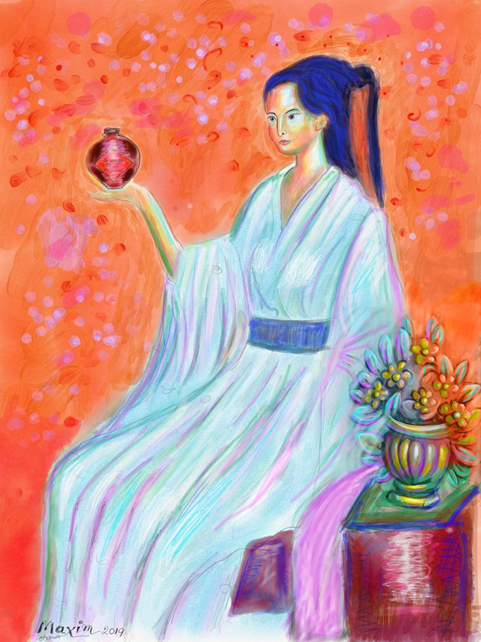 Abstract expressionism inspired by Modigliani. The plain background offers no distractions and allows us to gaze at the model’s beauty and her serene expressions. Modigliani would not paint the model’s eyes because they were too beautiful and too intimate. Elongated, angular lines and the sculptural tranquility on the sitter’s face allows for the possibility of the grasp of model’s personality through the eyes.  The blue color of the empty eyes for this case matches with the blue background color on the right side as if we see the background through the empty eyes. When Modigliani left the eyes empty, it is considered that he then had difficulties in understanding the character of the model. Every model has more characters. For the model having an ambiguous character, he blurred the eyes, or pupils. “I will paint your eyes when I find your soul.” It seems that the model looks at the world while we look into the model’s eyes to get into her thoughts.