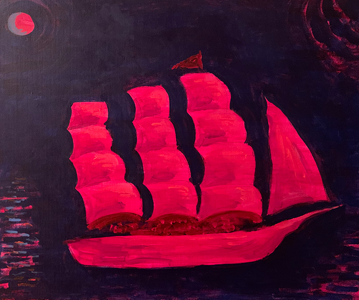 A small wooden boat with radiant red sails cuts through dark, moonlit waters, its wake shimmering in tones of blue and silver. Behind it rises a shadowed island, while above, a vast, swirling cloud seems to exhale wind into the sails, as if the night itself were guiding the journey. The glowing warmth of the vessel contrasts with the cool expanse of sea and sky, evoking solitude, movement, and a quiet trust in unseen forces. Painted in 2019, the work carries a dreamlike stillness—both intimate and cosmic.