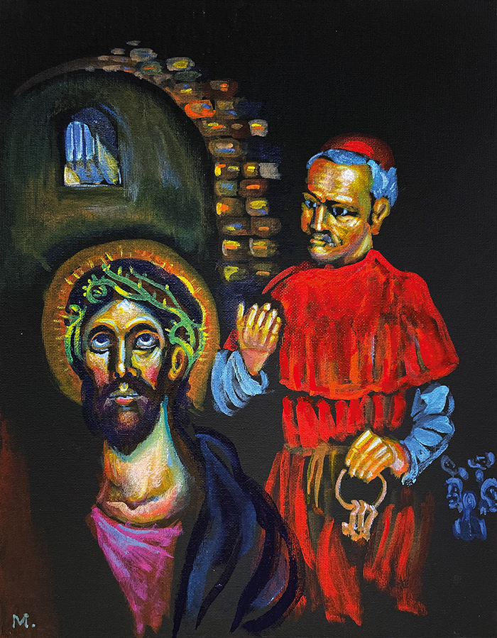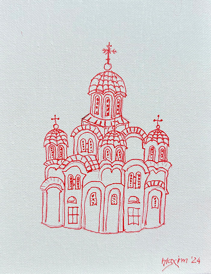 "City and Priest in One Heartbeat", acrylic on gesso board, Bishop Maxim, 2025