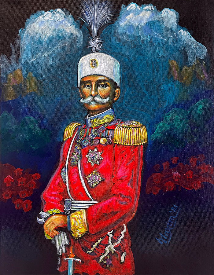 Earthy reds, ochres, and soft golds shape his face with gentle, impressionistic strokes, suggesting a life marked by wisdom and quiet strength. Cool highlights in his hair and eyes add clarity and depth. Behind him, the red-domed Serbian church evokes heritage and faith, while the medal at his chest glimmers with a note of well-earned honor. The composition radiates warmth, gratitude, and the enduring legacy of a man who gave so much.