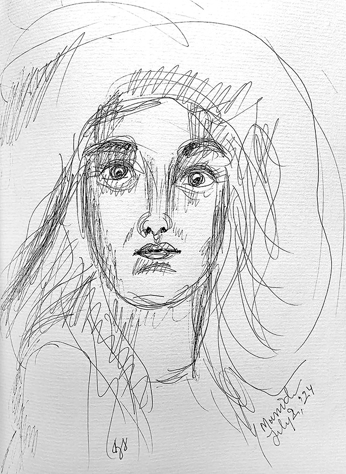 In this whimsical portrait, the gentle smile of a woman rises above the rolling neighborhoods and sparkling waters of San Francisco. Behind her, the bay opens like a luminous embrace—its islands, cliffs, and shifting blues echoing both the city’s restless energy and its quiet corners of refuge. Below, the houses—painted in joyful, childlike colors—climb the familiar hills with a playful rhythm, as if greeting her presence. The portrait’s soft lines and bright palette mingle tenderness with urban vibrancy, portraying a soul at home in the Bay’s ever-changing light, rooted in the warmth of place and the poetry of the city’s landscapes.