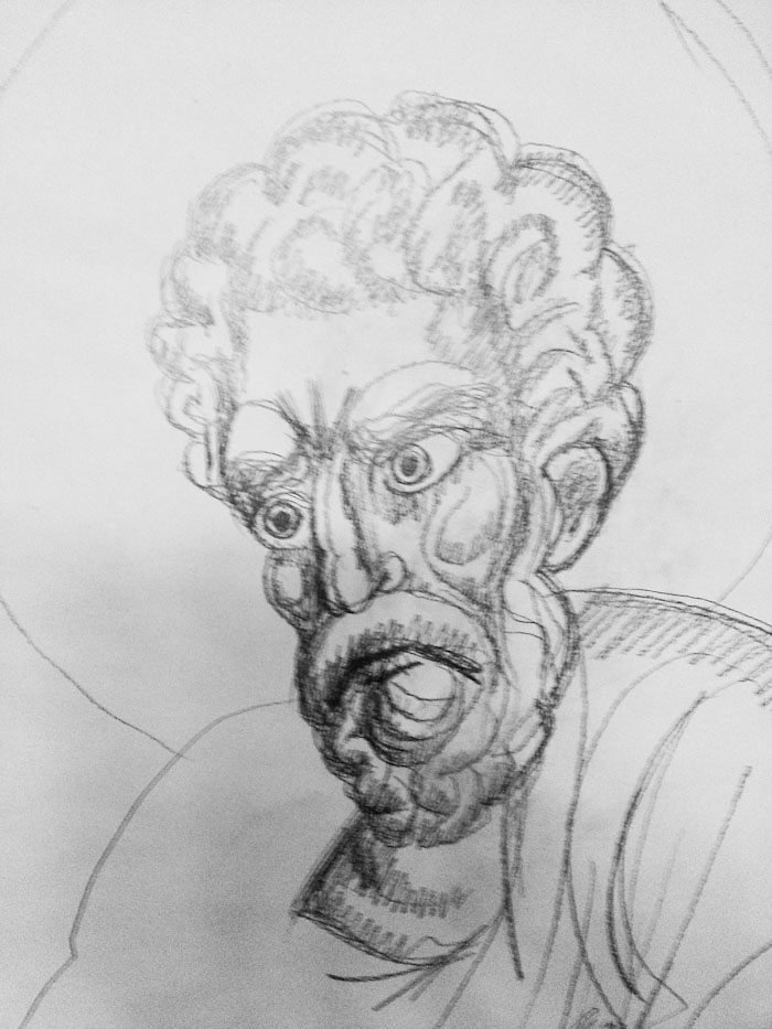 Now in May 2014, fr. Stamatis is designing the four Evangelists on paper so that the drawings can be copied on the walls of St Nektarios in Ano Voula, Attiki. Here is a detail of the drawing of St Mark during the rendering. (May 20, 2014)