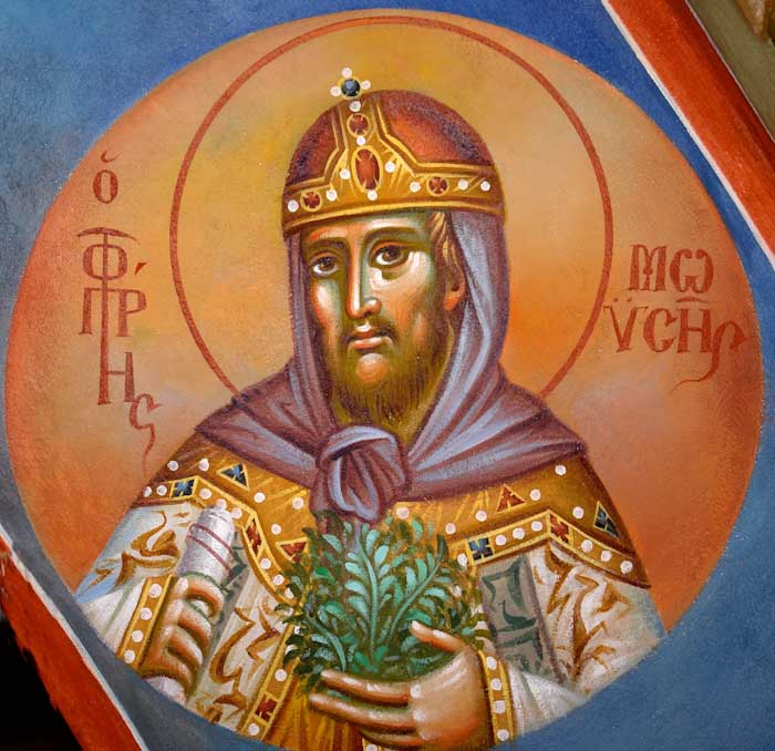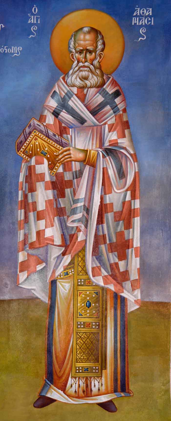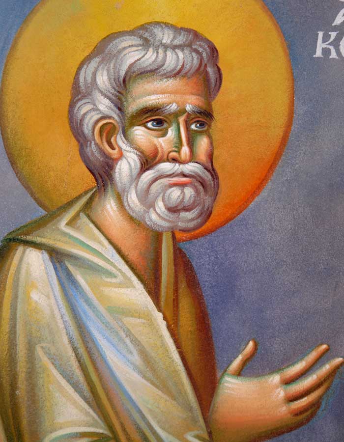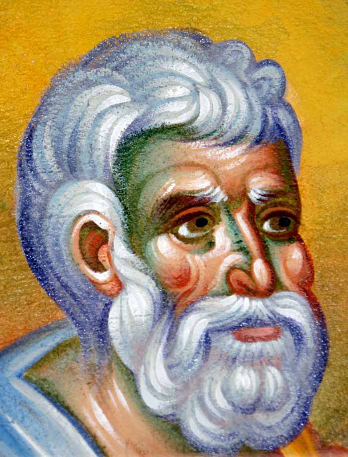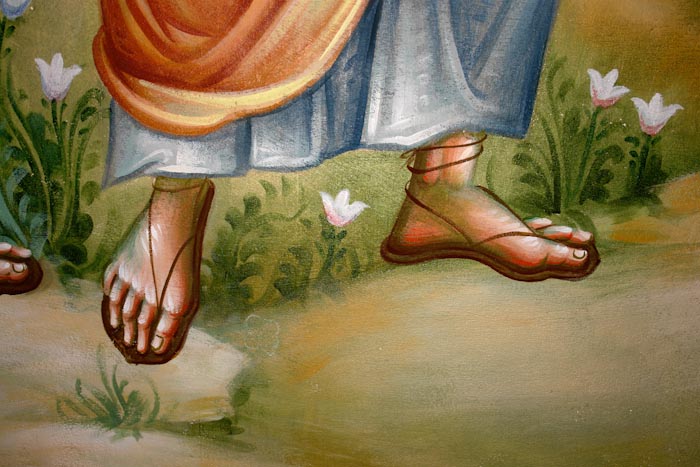 Fr Stamatis begins to paint St John the Theologian in St Nektarios, Ano Voula. Here are seen the first steps, a piece of Saint's garment.