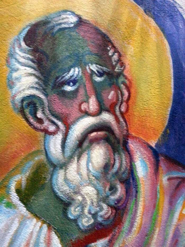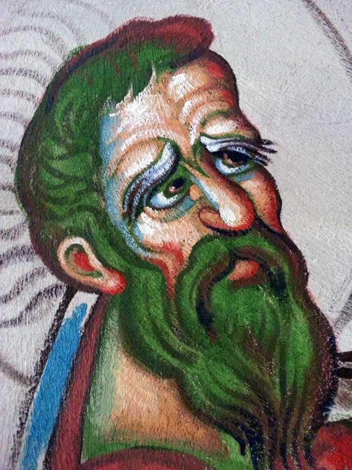 Unfinished face of St John the Theologian, who receives the divine inspiration to write the Gospel. The detail of wall-painting by Stamatis Skliris in St Nektarios Church, Ano Voula, Attiki. Friday, June 6, 2014