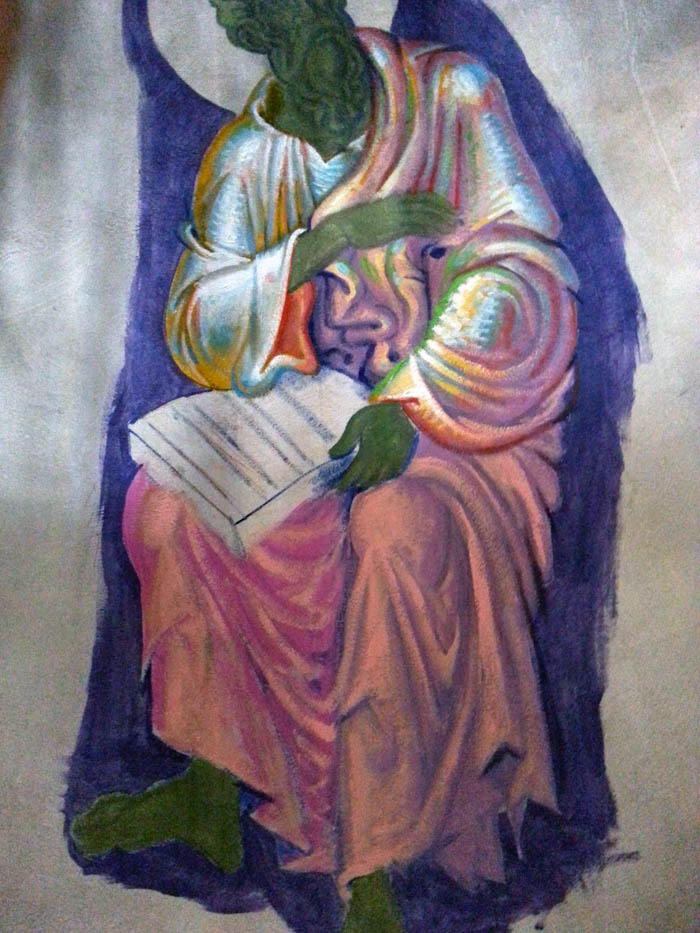 St Mark, wall-painting, Ano Voula. After painting the primer (proplasmos), the lines of the drawing were placed, followed by lighting (photismos).